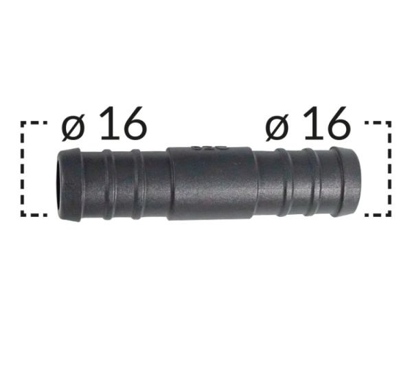 Univerzális műanyag toldó 16 mm-es belső átmérőjű tömlők számára.